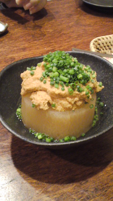 大根になんか(忘れてんじゃねえ…)乗せたやつ。アンキモだたかしら。全体に関西系の優しい味のお出汁で、素材によって全く味が変わるとゆう絶妙さ。おでんとかさ、ジャガイモとか入ってんのに、汁がまあったく濁ってないの。すっげすっげー!